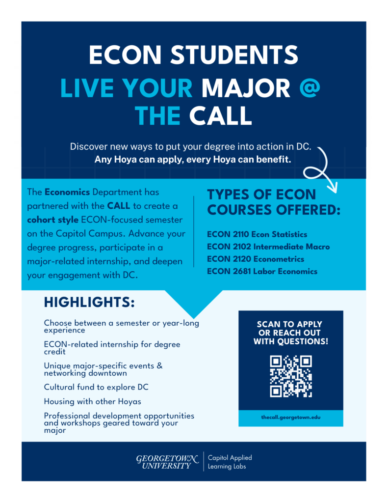 Posted on 1/15/26: Interested in joining the DC Semester in Economics at the CALL? Applications for the 2026–2027 academic year are now open! For the first time, you now have the opportunity to apply to the CALL for Fall 2026, Spring 2027, or the full academic year to further engage with DC and the Capitol Campus beyond the typical semester.