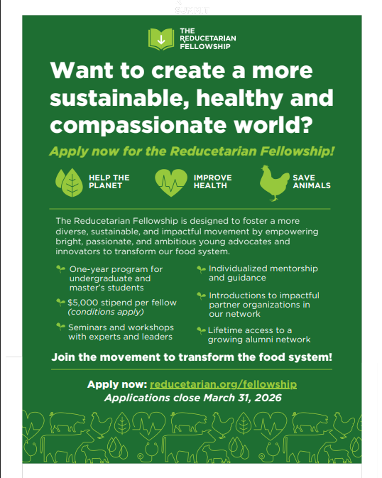 The Reducetarian Fellowship is a unique opportunity for students to begin building the knowledge, skills, and experience needed to make a tangible impact on our food system. This exciting program is designed to foster a more diverse, sustainable, and impactful movement to reform the food system by empowering bright, passionate, and ambitious young advocates and innovators who are eager to create a more sustainable, healthy, and compassionate world. Features include: 30+ in-person seminars and workshops, one-on-one mentorship from Fellowship staff, introductions to impactful